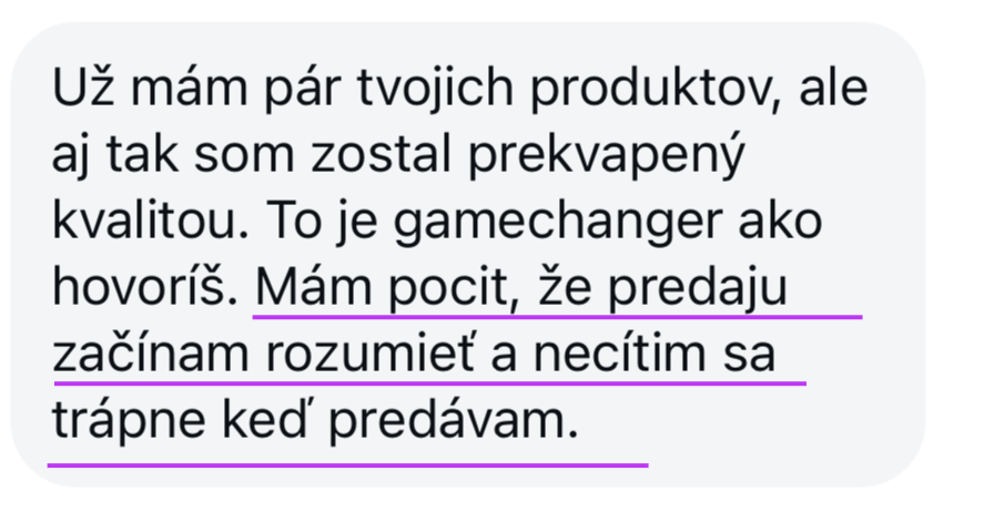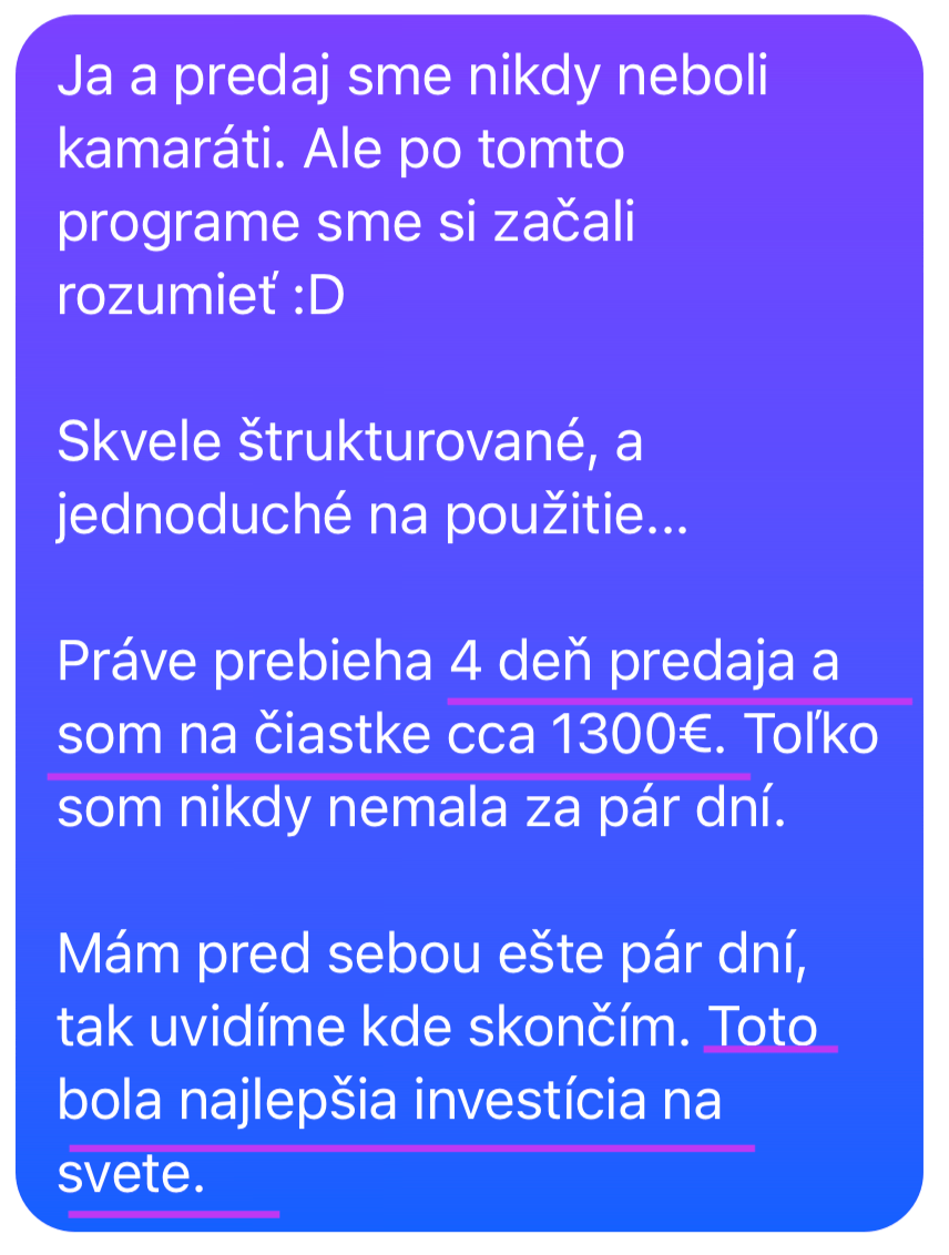 Najviac mi vyhovovalo, že program ma doslova previedol celým predajným cyklom – od zahrievania publika až po samotný predaj. Všetko bolo prehľadne vysvetlené, krok po kroku, a hlavne prakticky použiteľné.
